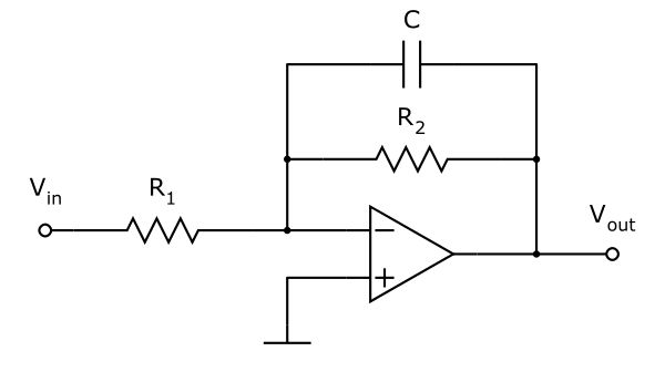 Sa fonction de transfert est : \(H(jw) = \frac {-R_2}{R_1} * \frac{1}{1+jR_2 Cw}\)